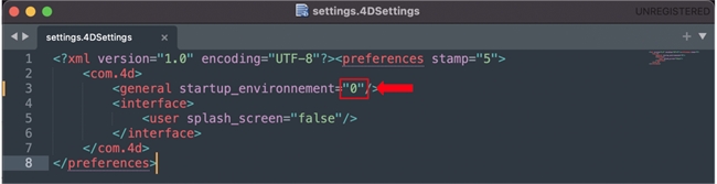- Within <com.4d> tags, set “startup_environnement” to 0, and save this file*