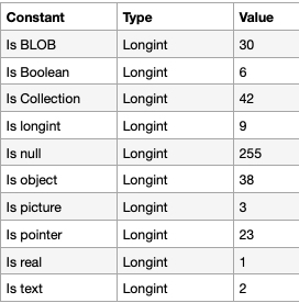 | // Utility Method - Util_ObjContains #DECLARE($obj : Object; $type : Integer)->$result : Boolean var $att : Text If (Count parameters=2) For each ($att; $obj) Until ($result) If ((Value type($obj[$att]))=$type) $result:=True End if End for each End if |