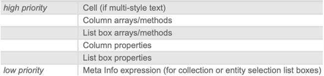 Note that the Meta Info Expression is very low priority. Therefore, if other style settings are defined through expressions in the Property List (i.e., Style Expression, Fornt Color Expression, Background Expression) the style settings made with Meta Info Expression will be ignored.
