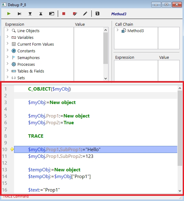 Using the 4D debugger can be helpful to investigate code to make sure it is running properly and identify issues. The debugger contains a source code pane that displays the code of the currently executed item, boxed in red in the following image: