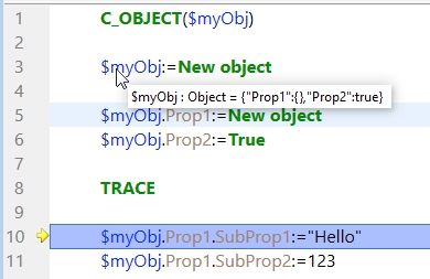 and at the current execution point of Line 10, the value is {"Prop1":{},"Prop2":true}