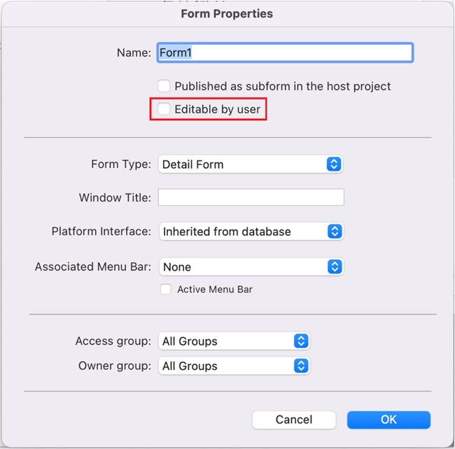 - The Form Properties window should open. Uncheck “Editable by user”, and click “OK”