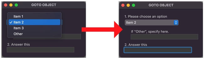 | // Drop-Down Menu Object Method // after user selects option, jumps to specified input box \ depending on option selected Case of : (Form event code=On Clicked) // user selects option $option:=OBJECT Get pointer(Object named; "dropdownMenu")-> If ($option=4) GOTO OBJECT(*; "Input") // "Other” is chosen, jump to next input box Else GOTO OBJECT(*; "Input1") // any other item is chosen, jump to question #2 End if End case |