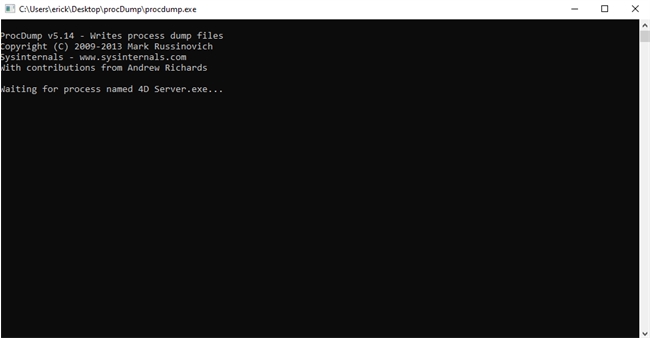 In a crash scenario, ProcDump is the typical first step when it comes to monitoring a 4D app and generating a dump file upon the next potential crash. To be sure ProcDump is actually monitoring the app (E.G. 4D.exe, 4D Server.exe, etc.), the terminal window should be visible below: