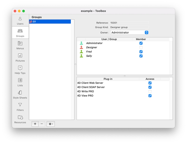 When saving and loading groups via the Groups editor, or using commands USERS TO BLOB and BLOBS TO USERS (binary mode only), make sure that the groups were originally created by the Administrator. Otherwise, any group membership modifications would not be saved/loaded properly. For example, the Designer creates a group “G1”. Afterwards, the Administrator assigns users “Sally” and “Fred” to G1 and saves groups to a “mem.4ug” file.