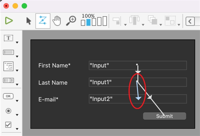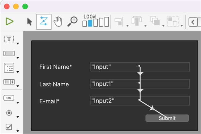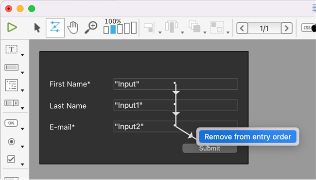 In both binary and project mode, the entry order is determined by the order in which the data entry form objects are added to the form in the form editor. Here, the entry order goes: First name, Last name, E-mail, Submit.