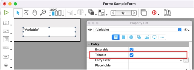In Binary Mode, the entry order is saved internally within the database, and the option to allow a field to be tabbed/entered into is managed by the field’s “tabable” property. If you want to remove an object from entry order, you would simply need to deselect the “tabable” property.