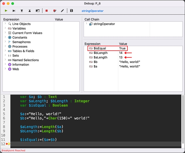 As you can see in the debugger above, $a and $b visually look the same but are inherently different. The comparison operator compares what is human readable, while the text length is dictated by what 4D internally interprets.