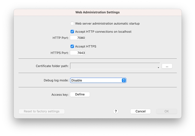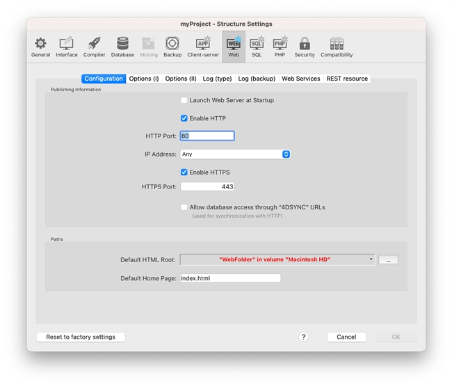 NOTE: If using 4D Server, on Windows, web settings can be accessed by opening Structure Settings from the Edit menu. On Mac, the Structure Settings can be accessed from the File menu.