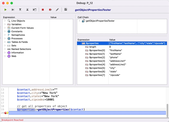 | // Get Object Properties Tester Method // tests the getObjectProperties method // declare variables var $contact : Object // create sample object $contact:=New object $contact.firstName:="John" $contact.lastName:="Doe" $contact.phone:=1234567890 $contact.addressLine1:="100 1st St." $contact.addressLine2:="" $contact.city:="New York" $contact.state:="New York" $contact.zipcode:=10001 // get all properties of object $properties:=getObjectProperties($contact) |