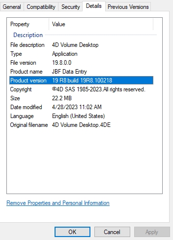 Right click 4D.exe / built app executable > Details