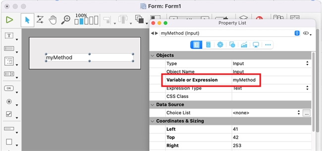 Here, we have a simple form with a single text input box that displays a numeric value. In the property list, the "Variable or Expression" property is populated with the name of a method, "myMethod". This method outputs the result of a simple arithmetic expression: