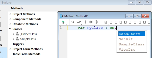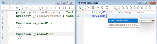 4Dv20 allows classes to have declared properties by using the property keyword. Properties will then appear in the autocomplete suggestions which can assist with writing code. In some cases, there may be the need to not expose certain properties. To hide a property from the autocomplete list, add an underscore character to the start of the property. This will also apply to other items like functions and even classes.