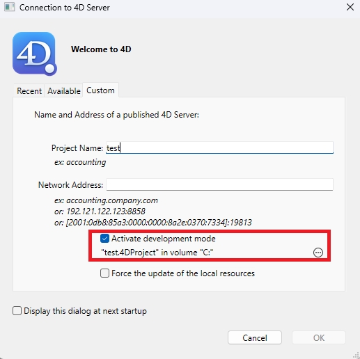 Be sure to use the current R release to be able to develop code via 4D Remote. To do so, have the 4D Remote client connect via Custom tab and check the "Activate development mode" box. Also make sure the .4DProject file is accessible to the client.