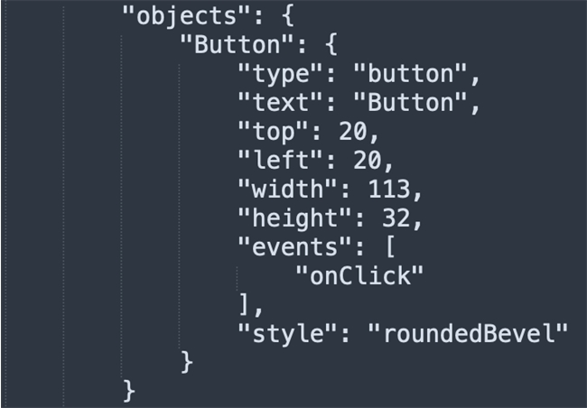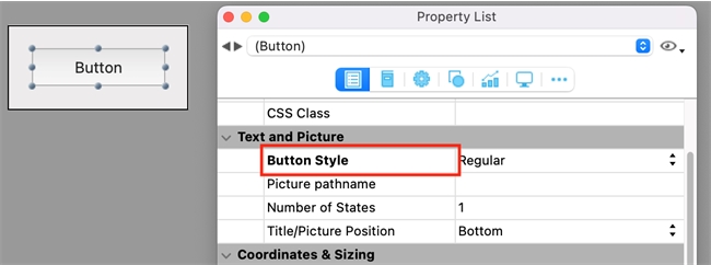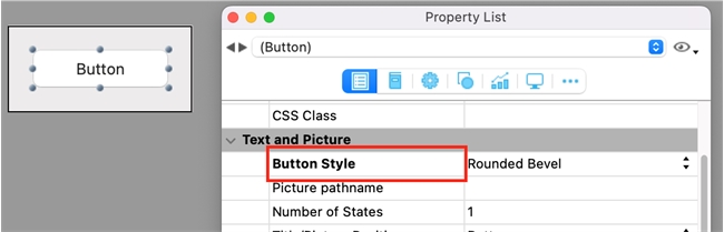 As mentioned earlier, the properties for each form element is defined in the form definition, which is saved on the disk as .4DForm file (in JSON syntax). By default, the property is not explicitly defined in the form definition; when changed, the property name will become bolded, and the button style property is added to the .4DForm file.