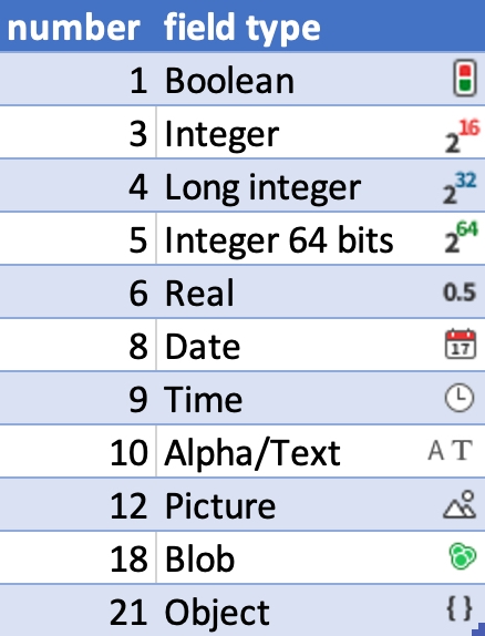 In a project application, the catalog.4Dcatalog is an XML file that stores the information of all tables and fields for the database structure. Each field node has an attribute called “type” that corresponds to the type of the field (Text, Date, etc.). The value of “type” does not explicitly state the name of the field type. Instead, the field type is indicated by a “number” (in quotes because the value is actually a string) in the XML. Below is a reference table that maps the “number” to actual field type:
