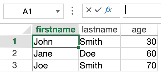 | var $options : Object var $data : Collection $data:=New collection() $data.push(New object("firstname"; "John"; "lastname"; "Smith"; "age"; 30)) $data.push(New object("firstname"; "Jane"; "lastname"; "Doe"; "age"; 60)) $data.push(New object("firstname"; "Joe"; "lastname"; "Smith"; "age"; 70)) $options:=New object("autoGenerateColumns"; True) VP SET DATA CONTEXT("ViewProArea"; $data; $options) |