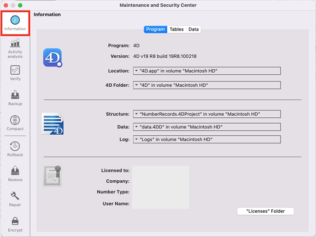 Open the Maintenance and Security Center window (go to Help > Maintenance and Security Center, or click on its icon if you have the toolbar displayed in designer mode). The "Information" page should automatically be displayed, but if not, click on the first icon on the left-hand side.