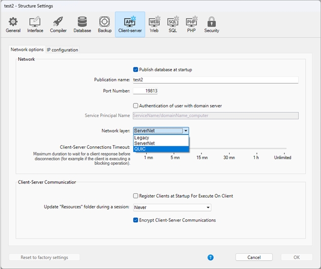 When using 20 R2 or newer with a .4DProject database, the QUIC network layer can be found under Settings > Client-server > Network layer.