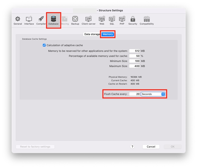 For preventative measures, ensure that the cache is set to flush at frequent intervals. This can be done by changing the value in the in the "Flush Cache every" setting in the database settings window under Database > Memory (see below):