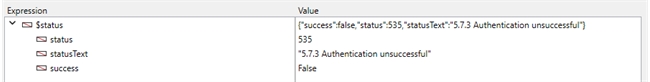 Instead, it is recommended to start using SMTP New transporter as a replacement as the returned result is an object containing attributes "status" for error code and "statusText" for the reasoning for the error. Take an authentication error example below: