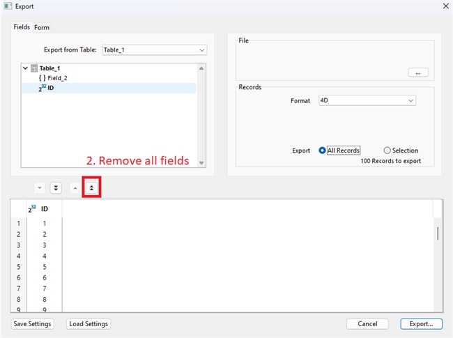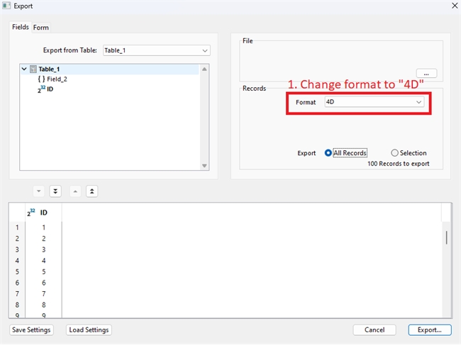When using 4D's built-in export via File > Export > Data to file, table object fields will not show up at first since the exported data type will default to text. Take the below where Table_1 has Field_2 which is an object field and note that Field_2 does not show up by default. To let object fields show up properly: