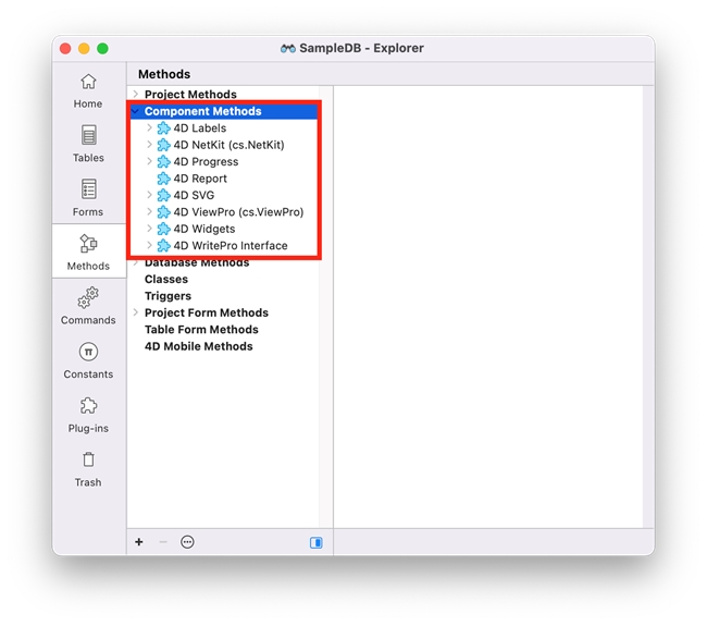 The above list can also be found by creating a new database, navigating to the Explorer window > Methods > Component Methods dropdown item.