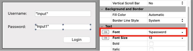 The same effect can be applied by using the font-family CSS property with the value of \25password, in an external style sheet. An example of the CSS code is shown below.