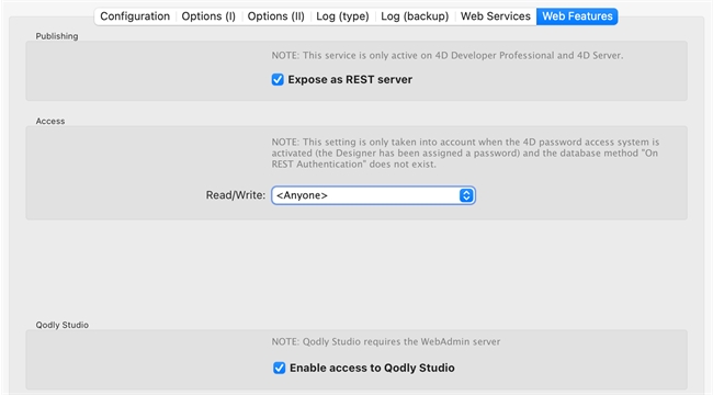If all of the requirements are met, Qodly Studio can be enabled and used. Qodly Studio has to be enabled from two settings. If any of the requirements are not met, these settings may not display. The first is the Database Settings. Under the "Web" section's "Web Features" tab, a new section has been added for Qodly Studio, which has one option to "Enable access to Qodly Studio":