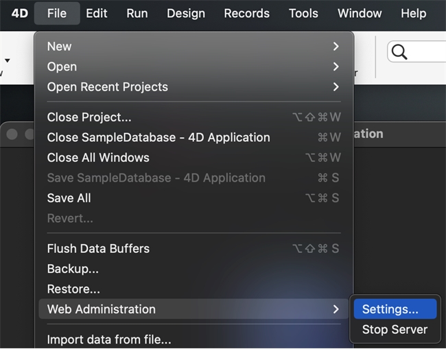 With Qodly studio access enable in both settings, Qodly Studio can then be accessed. Qodly Studio can easily accessed from the 4D Design menu: