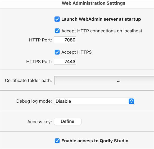 The Web Administration settings will also have a section at the bottom for "Enabling access to Qodly Studio":