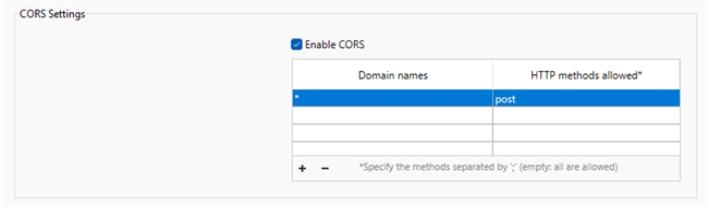 The setting can be applied in two ways. In any of the ways to apply, first CORS must be enabled. Then various domains can be specified along with which HTTP methods are allowed for the domains. The domains also accept the asterisk character as a wild card.
