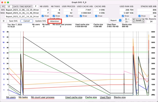 Within this window, you enable/disable the view of specific trend lines, select a specific date and time to investigate the data gathered at that specific point in time, and export your findings. If you click on the Attention button, the component can also point out anomalies at a certain point in time.