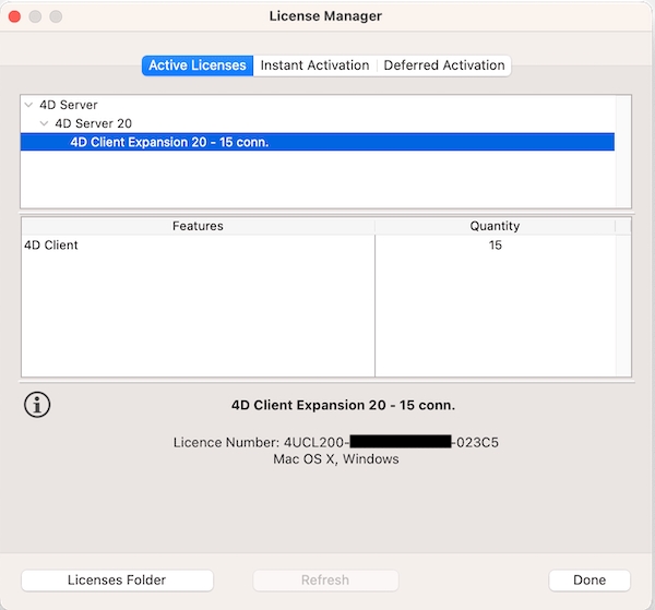 Below is an example of how the license manager and license folder looks after activating just the client expansion license. Only the v20 server license is shown under the license folder, even when the expansion license is in the license manager window.