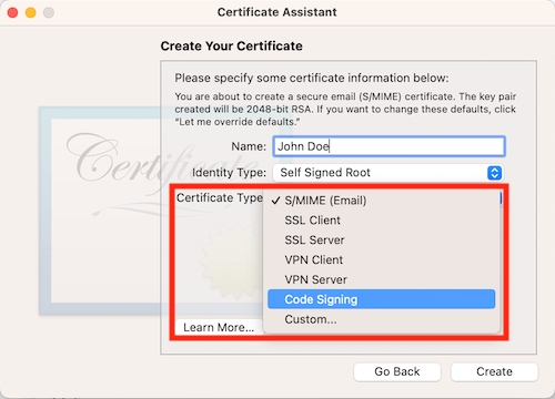 The solution to this issue is to make sure when creating your own certificate, that the certificate is of “Code Signing” type. By default, the certificate type is of S/MIME (Email), which will not give the correct keychain access when building for MacOS.