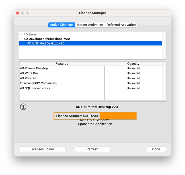 When browsing for the .license4D file in Licenses folder, it may be difficult to determine the correct Unlimited Desktop license number among all of the other licenses. To confirm the correct the license number, go to Help > License Manager…, and in the Active Licenses tab, locate the active developer license (bolded). Expand the developer license and select the Unlimited Desktop license under it. The license number will be shown below the name towards the bottom.
