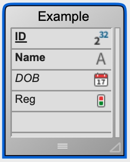 In the Example table above, the “ID” field is the primary key (with automatic indexing), the “Name” field has B-tree indexing, and the “DOB” field is set to be Invisible. Note that primary key fields are usually both underlined and bolded.