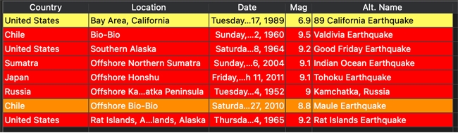 | #DECLARE()->$color : Integer Case of : (This.Magnitude>=9) //9.0 and above $color:=0x00FF0000 : (This.Magnitude>=7) //7.0 and above $color:=0x00FF8C00 : (This.Magnitude<7) //less than 7.0 $color:=0x00FFFA5C End case |