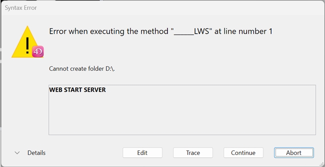 This error can occur when the default HTML root path is set to an inaccessible location on the disk. For example, in the first screenshot of the error, the D drive cannot be accessed by 4D because the account password for that drive has expired. To resolve this issue, make sure that the location is accessible to 4D, or change the default HTML root path in web settings to a different location that is accessible.