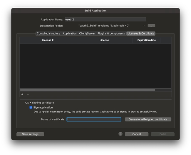 This option is enabled by default, and the "Licenses & Certificates" tab can be easily missed as the applicatoin builder does not require you to select any of the options there in order to enable the "Build" button to build the application. Ensure that this option is unchecked and the built application should be created successfuly.