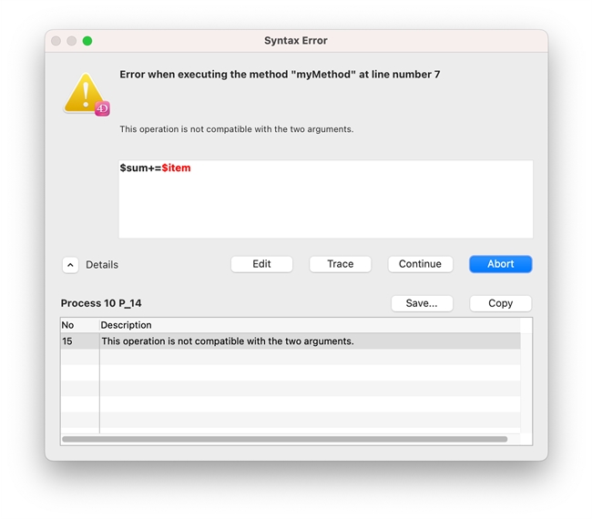 | // myMethod #DECLARE($coll : Collection) : Boolean $sum:=0 For each ($item; $coll) $sum+=$item End for each return $sum>15 |
