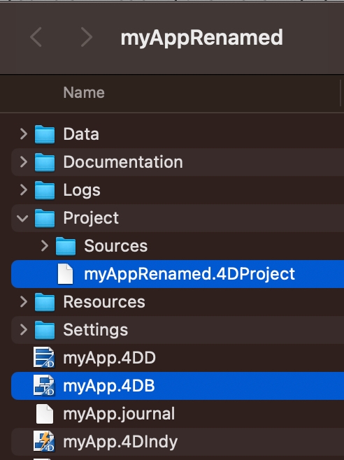 The main file of the project will be the .4DProject file, which serves as the anchor to locate other project files. When the .4DProject file is created in this way, its file name may not match the file name of the binary .4DB file. This is because the .4DProject file name is taken not from the .4DB file name, but from the name of the parent directory of the binary and project files; so if, for example, just the parent folder happened to be renamed prior to performing export structure to project, the .4DProject file name will match the folder's new name.