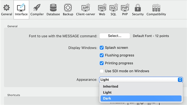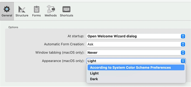 One thing to note is that 4D has two settings to apply the color mode. The first is for the main 4D application such as the form editor windows, the structure editor, the explorer window, or ect. This is only available on macOS and is part of the preferences/ 4D Settings:
