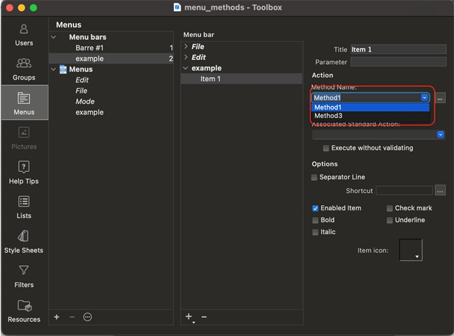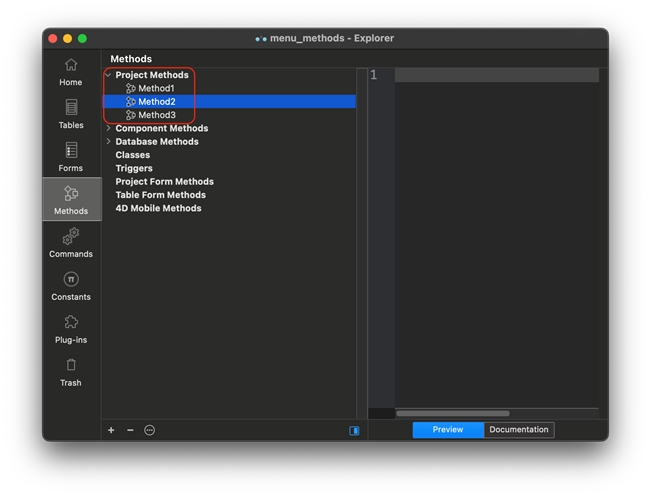 Notice that "Method2" appears as a project method in the Explorer, but does not appear as an option when attaching a method to a menu item.