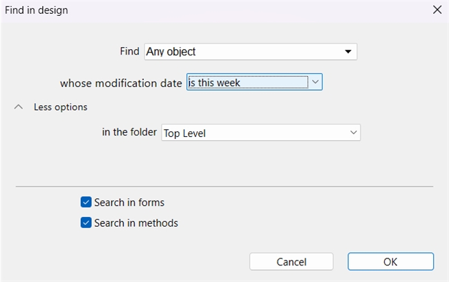 In design mode, the Find in design feature allows a filter to specify the modification date. A generic list can be compiled by specifying a search for "Any object" under a specific modification date. This is available to both binary and project mode databases.