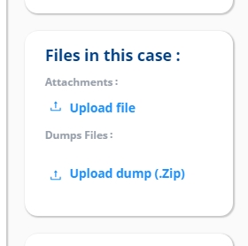 The Zip file can then be uploaded to a Support case in the "Files in this case:" > "Dump Files:" > "Upload dump (.Zip)" action:
