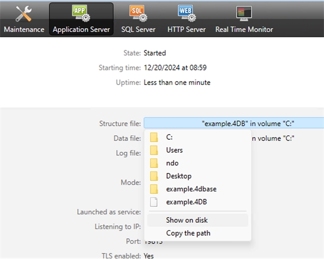 If the location of the current structure or data file needs to be found quickly, in the 4D Server Administration window, go to the Application Server tab. Then, in the Configuration section, click the file name of the structure/data file to open a pop-up menu.