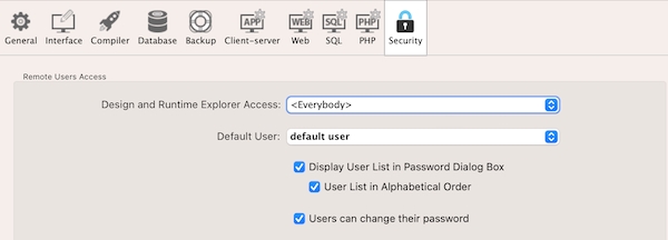 To set it up, first assign a password to the “Designer” user under Toolbox > Users. Without this step, the following instructions will not work as planned. Then, create a new user with whatever plug-in permissions you wish a default user to be granted. Afterwards, navigate to Settings > Security > Remote Users Access, and select the new user from the drop down menu for default users.