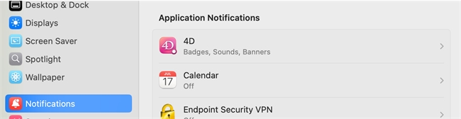 If 4D does not appear under the list of Application Notifications in macOS System Settings — this could happen after upgrading to a newer macOS — try opening 4D and manually sending a notification by running the DISPLAY NOTIFICATION command. After the notification is sent, this should trigger macOS to add 4D to the list of Application Notifications settings.