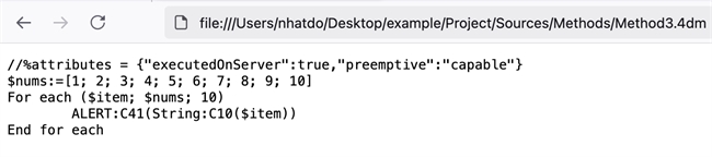 When the contents of a project file need to be viewed quickly, and 4D or other code editors are not accessible, the file can be dragged and dropped into a web browser, such as Chrome or Firefox, to display its contents. In the example below, a .4dm file was dropped into a Firefox browser window to show its contents. Note that any project files opened in this way are read-only.